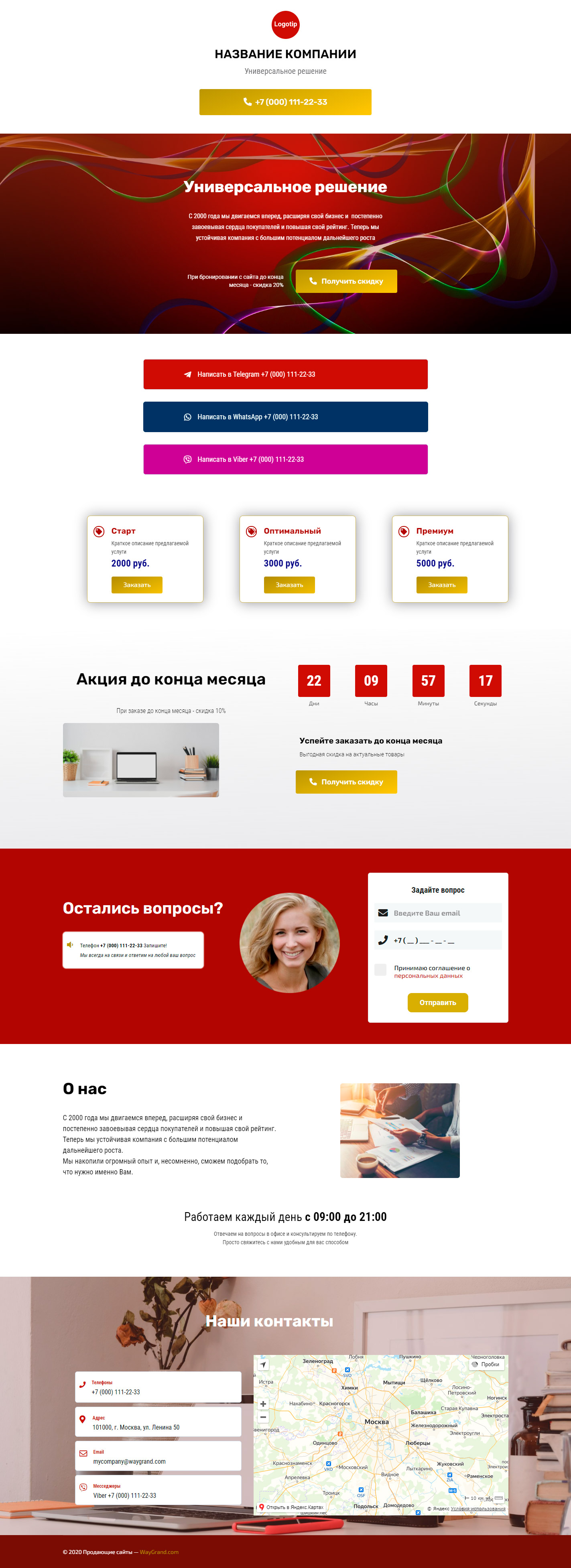 - Промоблок "Универсальное решение" с кнопкой призыва к действию "Получить скидку"